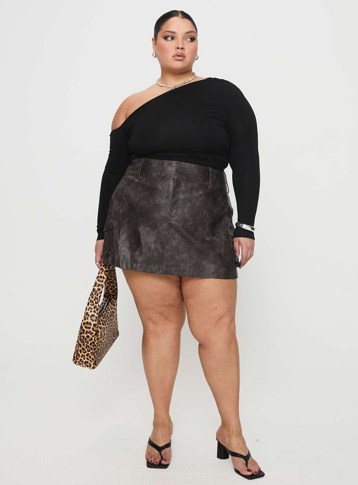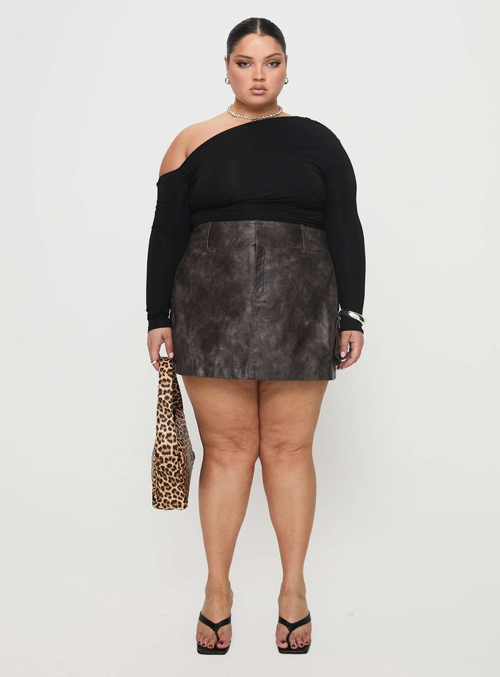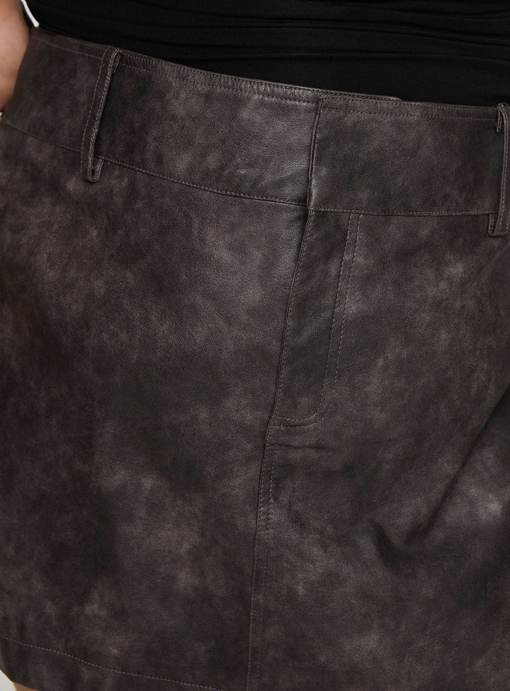 Domenic Suni Deri Mini Etek Yıkanmış Siyah Eğri