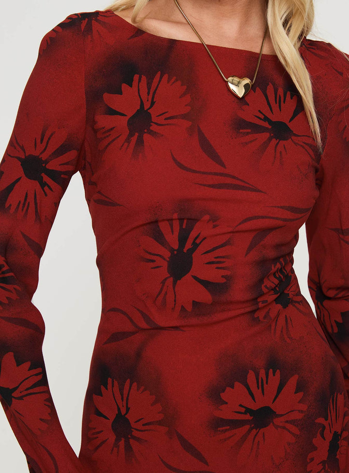 Feyd Uzun Kollu Mini Elbise Kırmızı Çiçek Desenli