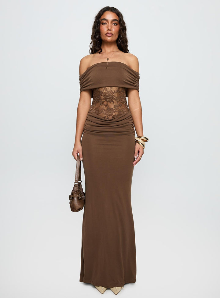 Gwendolen Omuz Açık Uzun Elbise Kahverengi