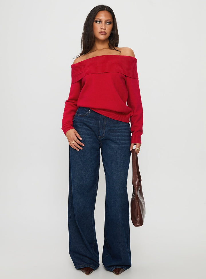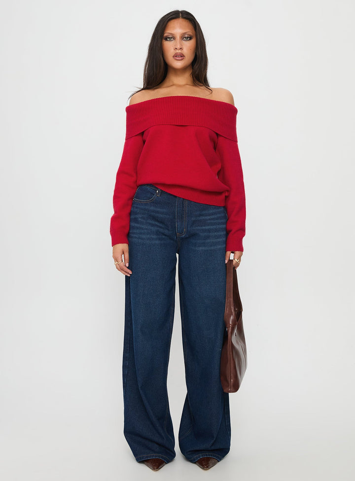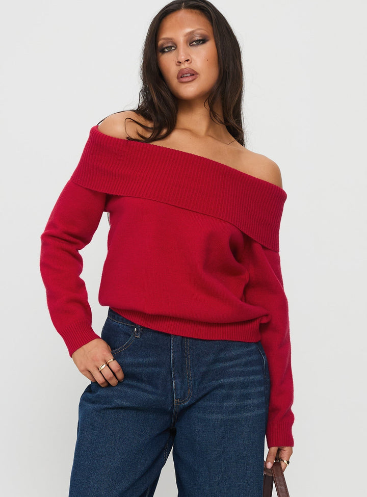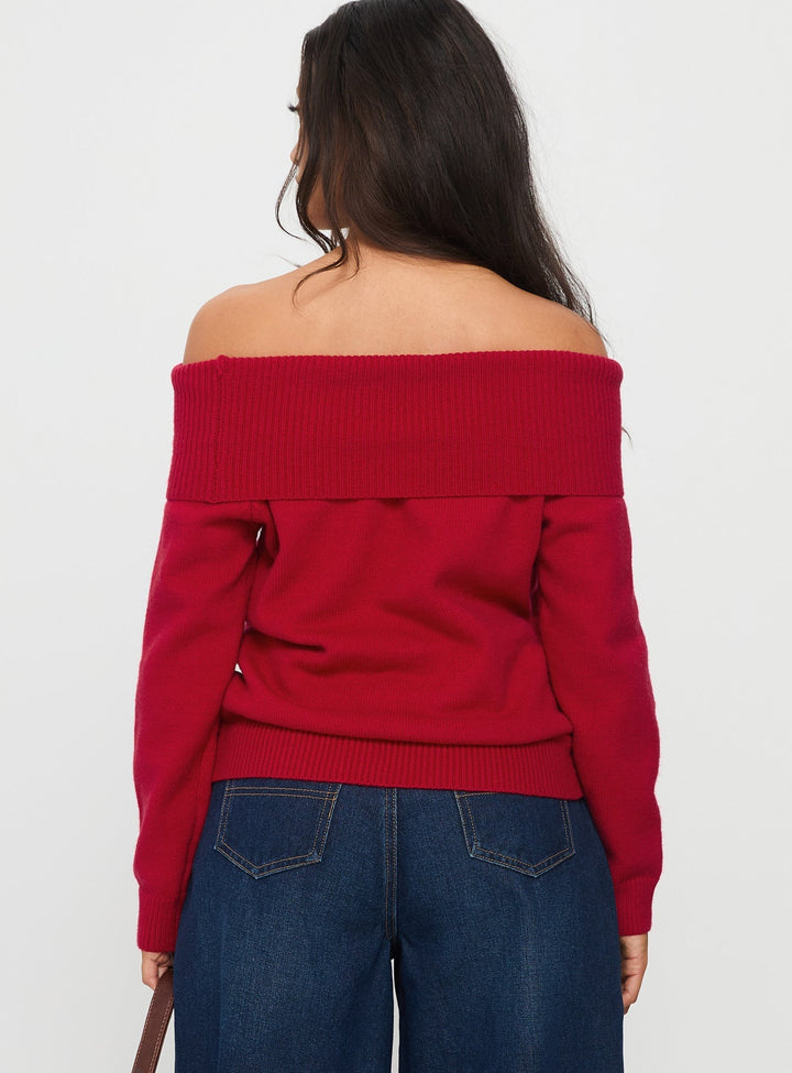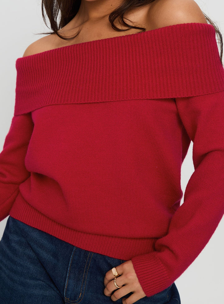 Jaycelyn Omuz Açık Örgü Kazak Kırmızı