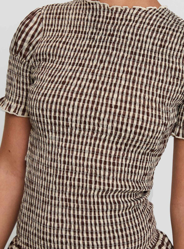 Laurita Büzgülü Mini Elbise Kahverengi Kareli