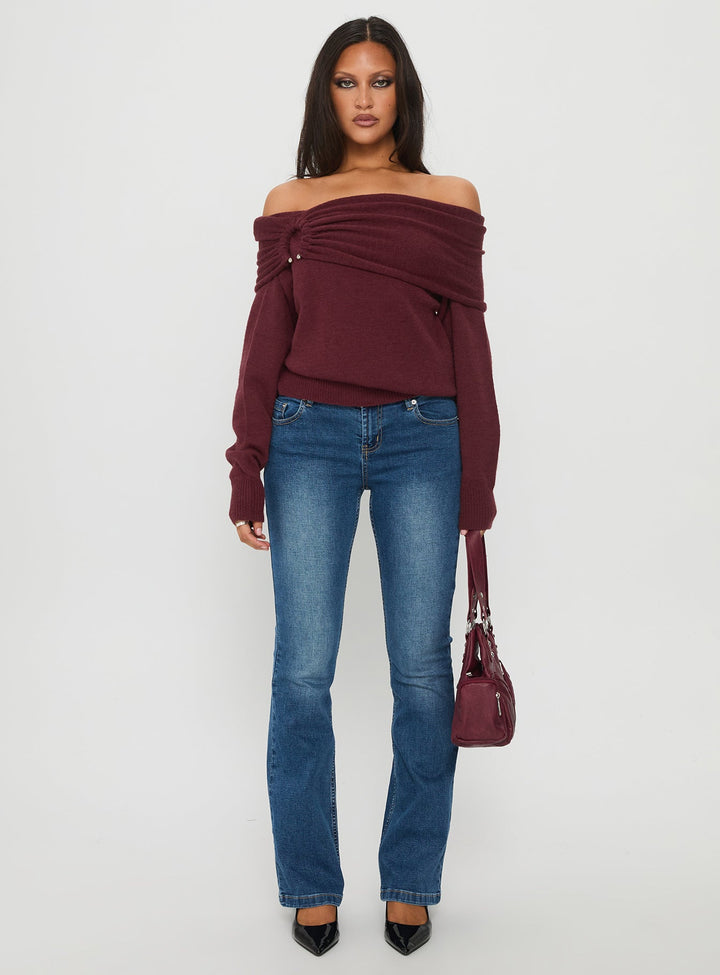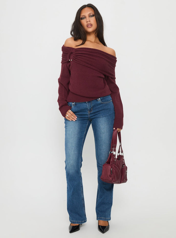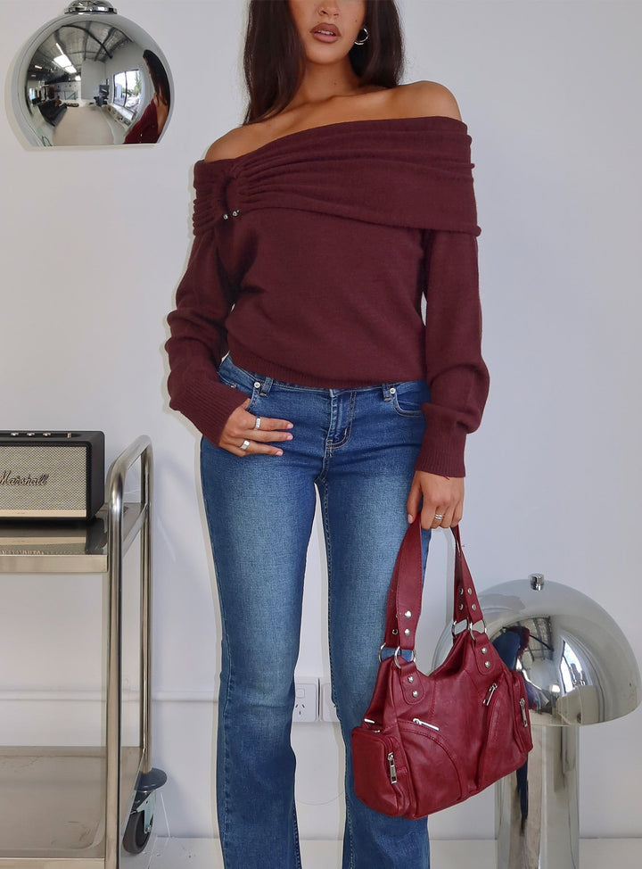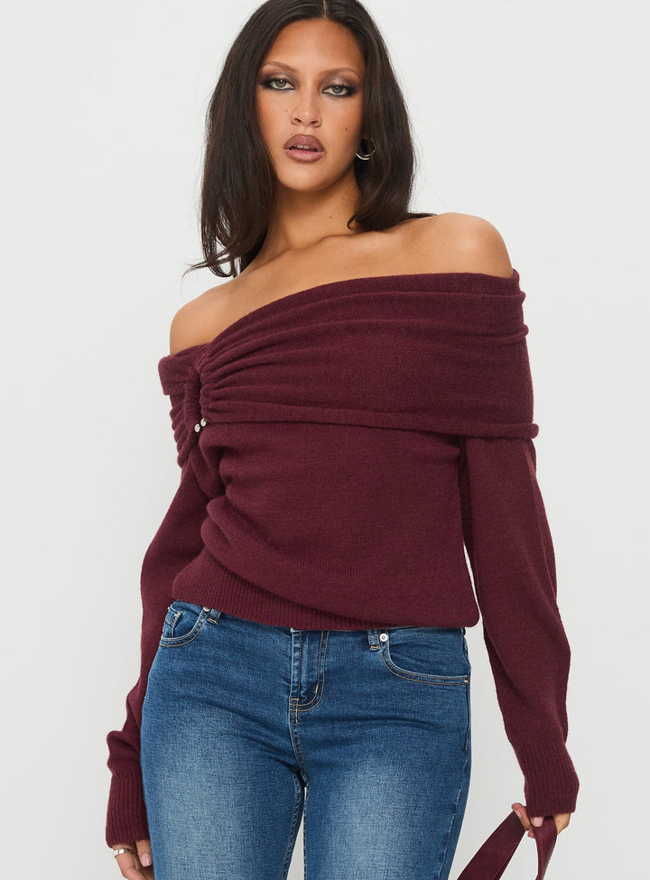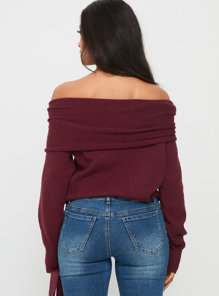Viora Omuz Açık Örgü Kazak Şarap