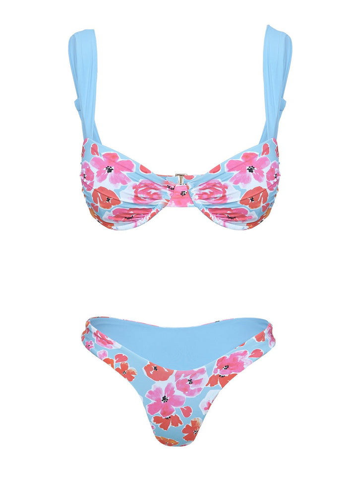 Yenna Yüksek Kesimli Büzgülü Bikini Altı Çiçekli Mavi / Pembe